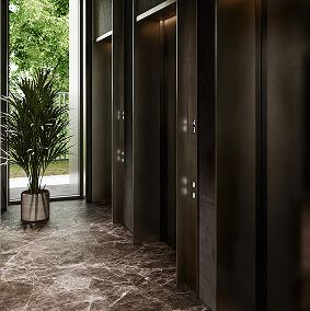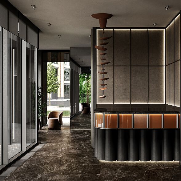 Лобби башни «Созидание» выполнено в насыщенных глубоких тонах с тёмным травертином на полу и дубовым шпоном на стенах. Высокие потолки 4,95 м дают ощущение простора и сдержанной элегантности.